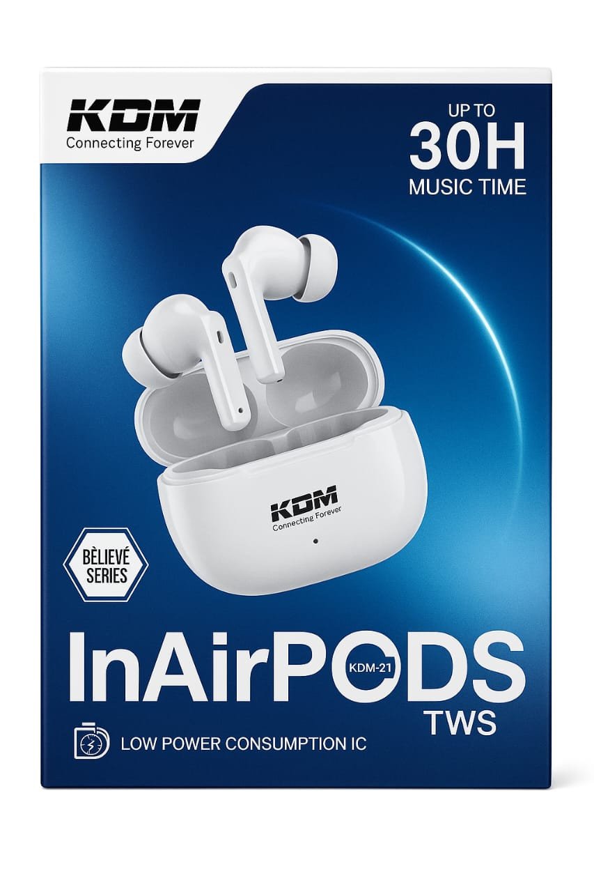 Enjoy true wireless freedom with the KDM-Z1 InAirPODS TWS Earbuds – designed for non-stop music, calls, and entertainment. With a powerful 250mAh battery, these earbuds offer up to 30 hours of playtime including the charging case.