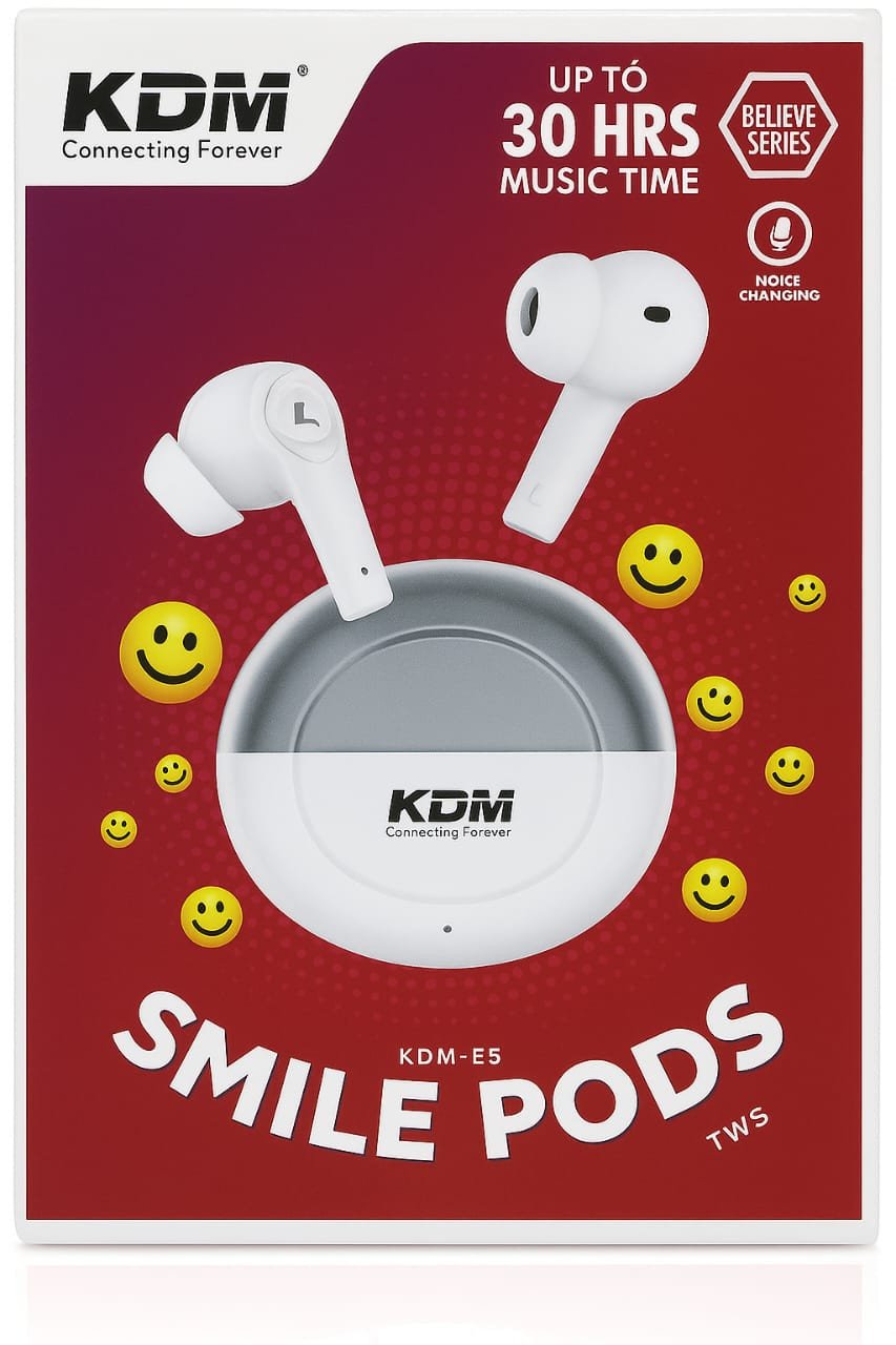 Upgrade your music experience with the KDM Smile Pods (KDM-E5) — stylish, lightweight, and engineered for superior sound. These TWS earbuds offer Bluetooth v5.4 for instant pairing and smooth connectivity up to 10 meters. With 280mAh battery backup and up to 30 hours of playtime, you stay charged through workouts, calls, and long commutes.The Smile Pods come with a voice changing feature, making your calls more fun and interactive. Perfect for jogging, working, or gaming. The sleek charging case includes a free silicone cover, adding an extra layer of protection.Whether it's work or play — the Smile Pods are your perfect wireless companion. Experience crystal-clear sound, modern aesthetics, and a touch of joy with every beat
