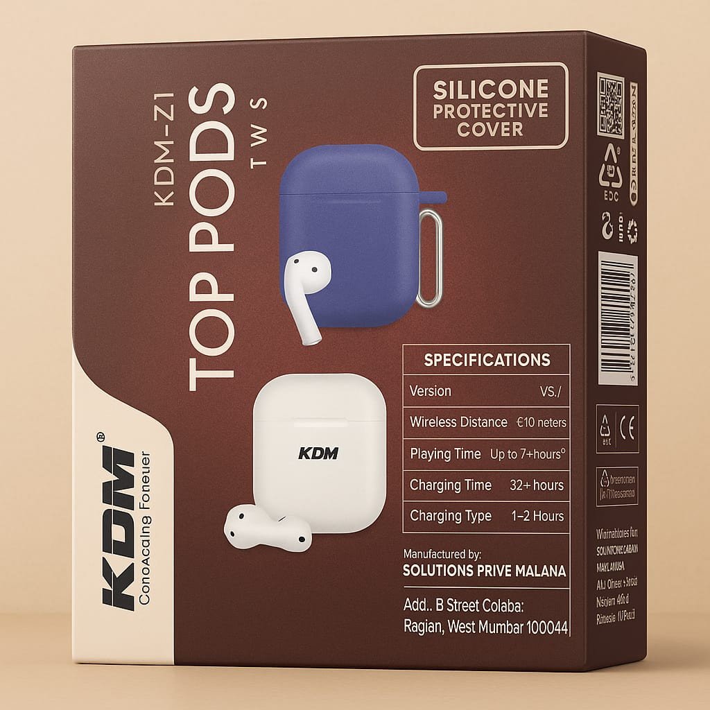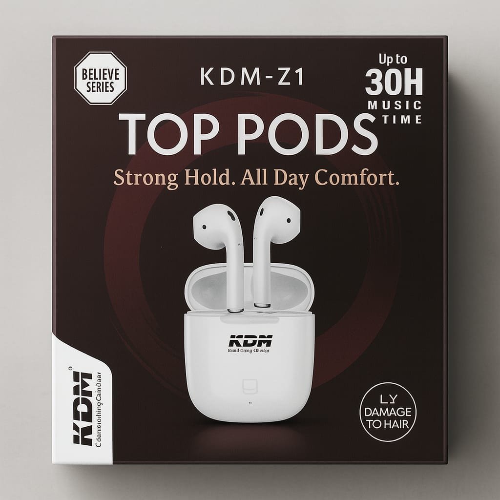 KDM-Z1 TOP PODS TWS are compact and stylish wireless earbuds designed for a powerful audio experience. With Bluetooth 5.0 and a high-quality 250mAh charging case, enjoy up to 30 hours of total playback time. Whether you're listening to music, taking calls, or gaming, these earbuds deliver comfort, clarity, and convenience.