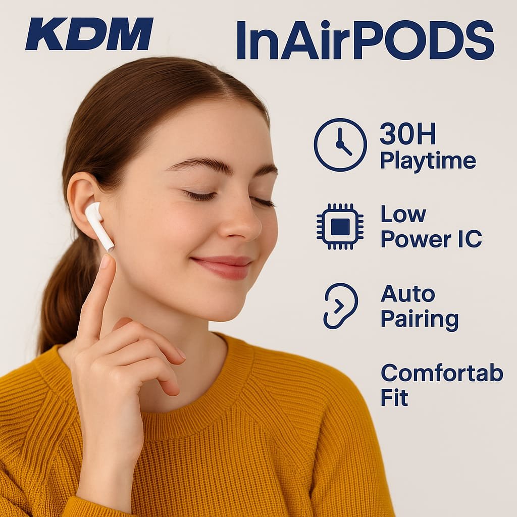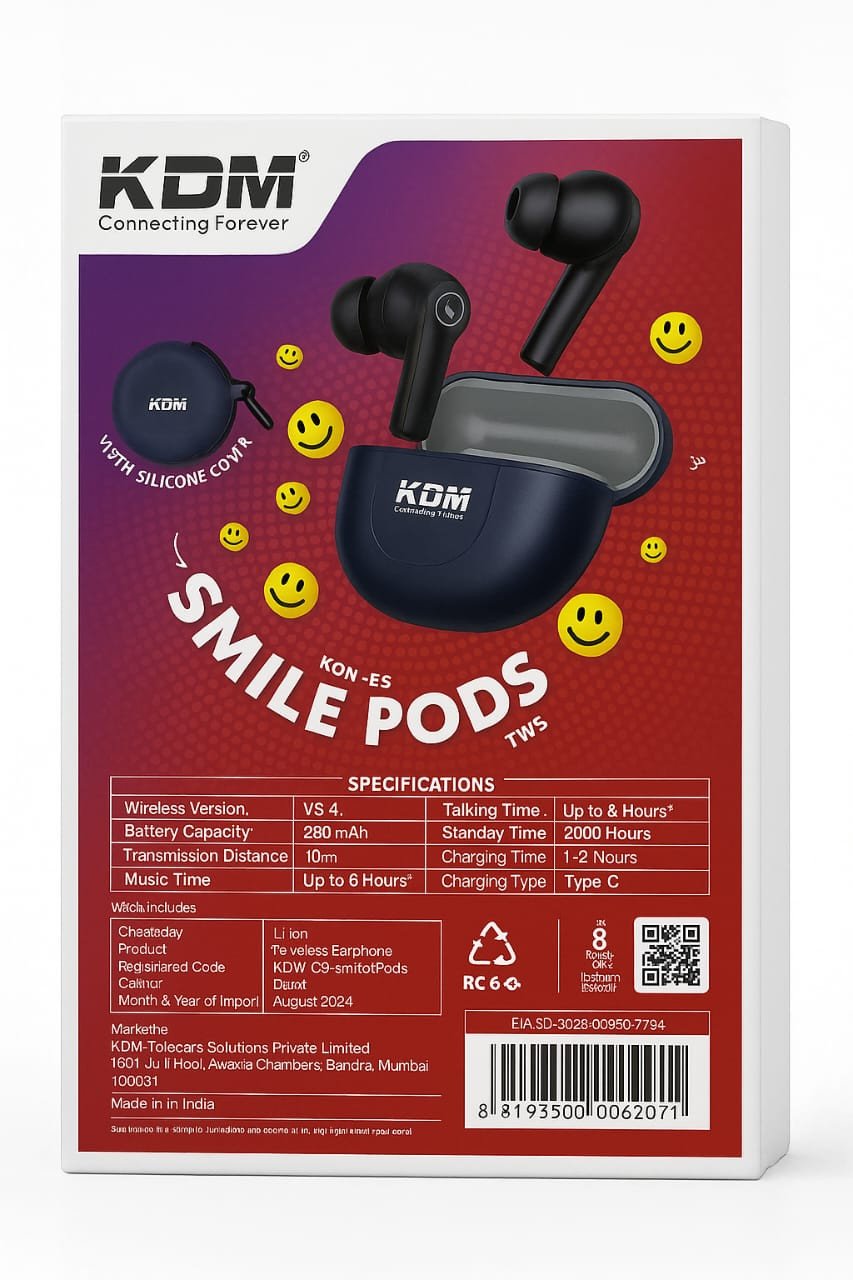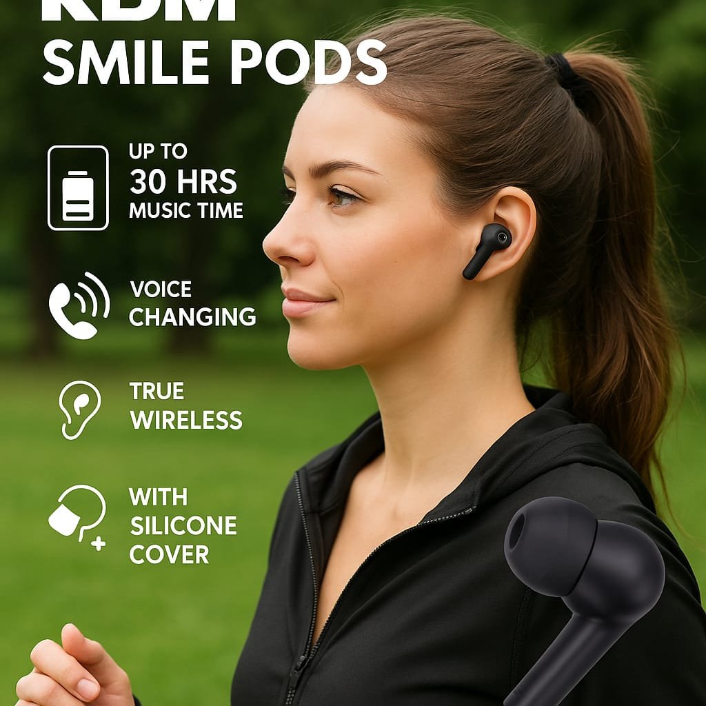 Upgrade your music experience with the KDM Smile Pods (KDM-E5) — stylish, lightweight, and engineered for superior sound. These TWS earbuds offer Bluetooth v5.4 for instant pairing and smooth connectivity up to 10 meters. With 280mAh battery backup and up to 30 hours of playtime, you stay charged through workouts, calls, and long commutes.The Smile Pods come with a voice changing feature, making your calls more fun and interactive. Perfect for jogging, working, or gaming. The sleek charging case includes a free silicone cover, adding an extra layer of protection.Whether it's work or play — the Smile Pods are your perfect wireless companion. Experience crystal-clear sound, modern aesthetics, and a touch of joy with every beat