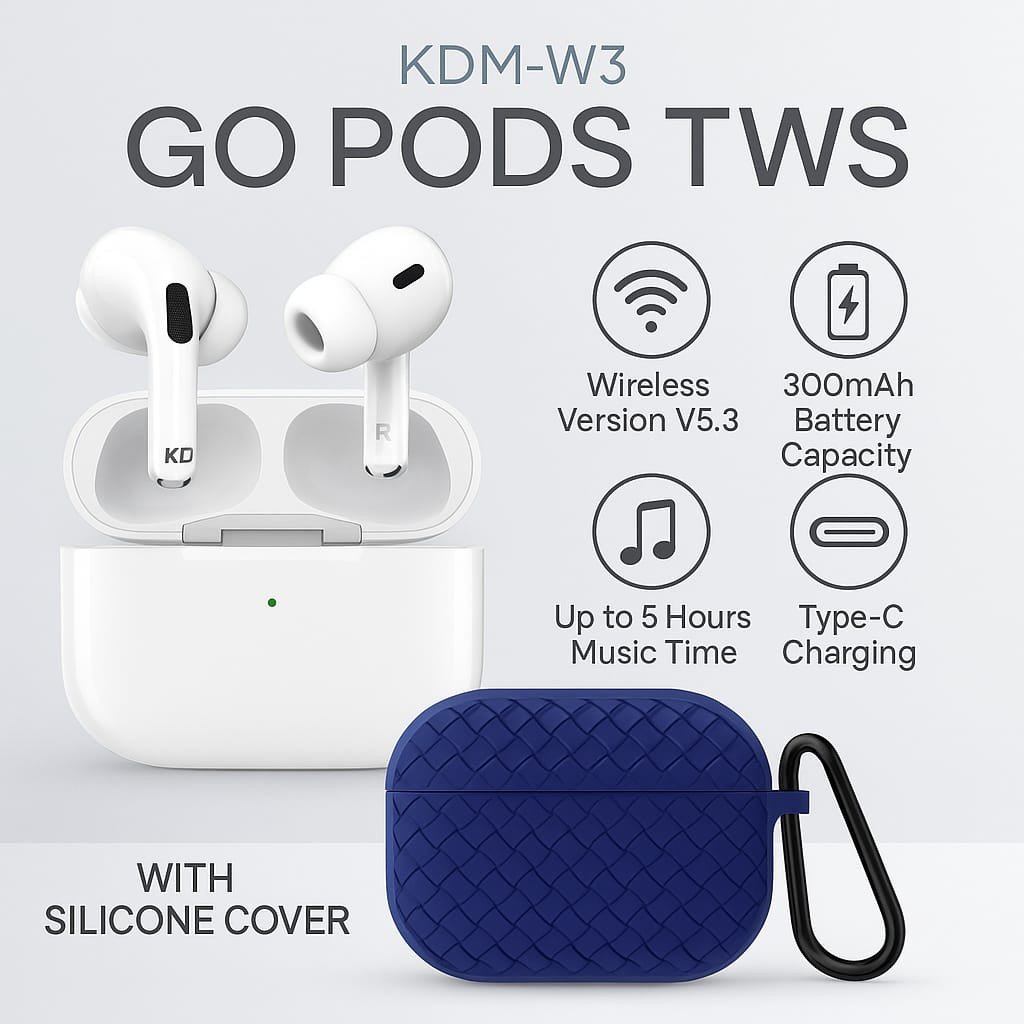 The included premium silicone cover not only protects your earbuds but adds a stylish edge to your accessories. With a 300mAh charging case, Type-C fast charging, and a lightweight, compact build, the KDM Go Pods V3 are your perfect travel and workout companions.